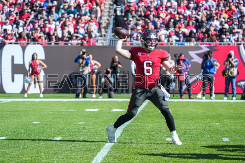Tampa Bay, Florida, USA, December 31, 2023, Tampa Bay Buccaneers quarterback Baker Mayfield #6 makes a pass at Raymond James Stadium. (Photo Credit: Marty Jean-Louis)