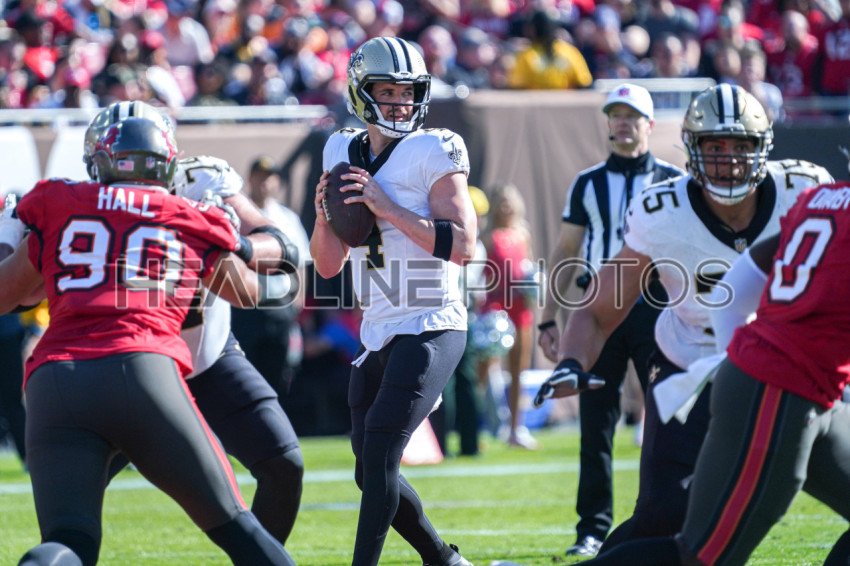 Tampa Bay, Florida, USA, December 31, 2023, New Orleans Saints quarterback Derek Carr #4 look to make a pass at Raymond James Stadium. (Photo Credit: Marty Jean-Louis)