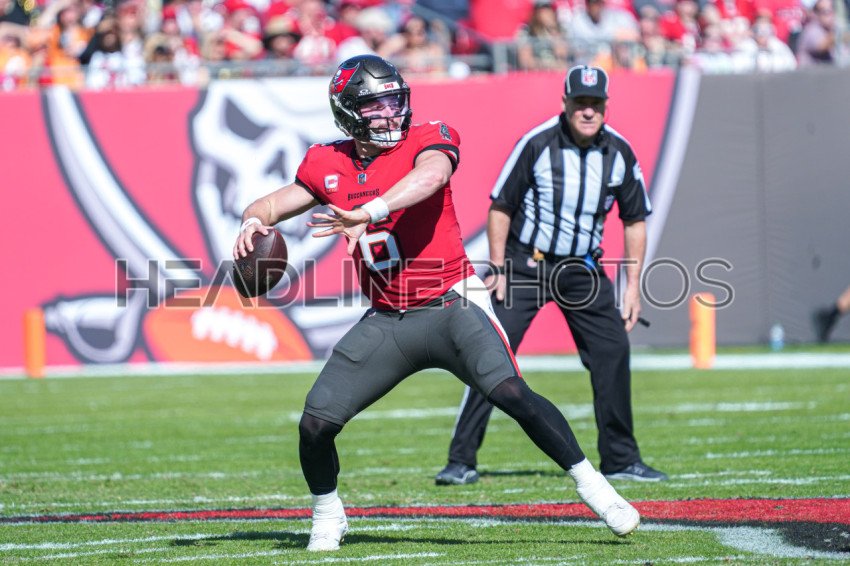 Tampa Bay, Florida, USA, December 31, 2023, Tampa Bay Buccaneers quarterback Baker Mayfield #6 makes a pass at Raymond James Stadium. (Photo Credit: Marty Jean-Louis)