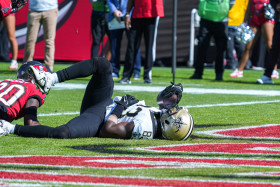Tampa Bay, Florida, USA, December 31, 2023, New Orleans Saints tight end Juwan Johnson #83 makes a touch down at Raymond James Stadium. (Photo Credit: Marty Jean-Louis)