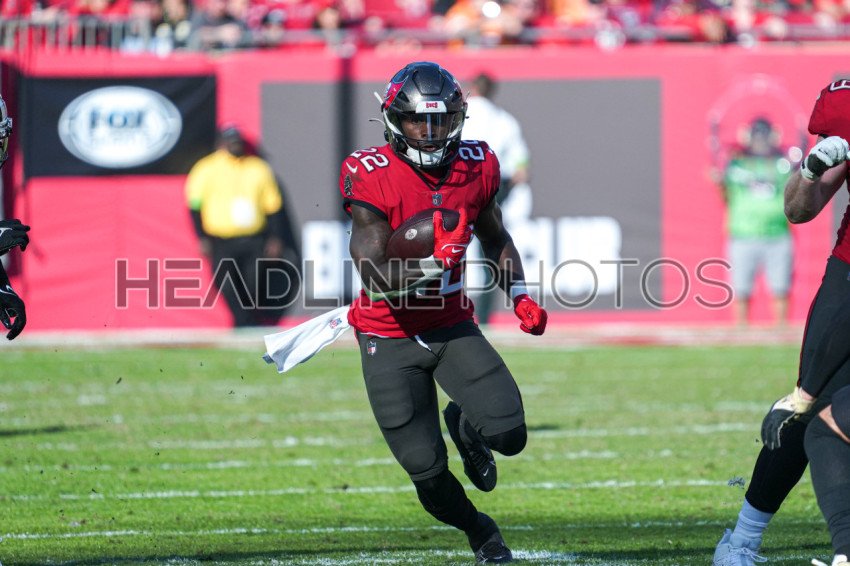 Tampa Bay, Florida, USA, December 31, 2023, Tampa Bay Buccaneers running back Chase Edmonds #22 makes a run after receiving a pass at Raymond James Stadium. (Photo Credit: Marty Jean-Louis)