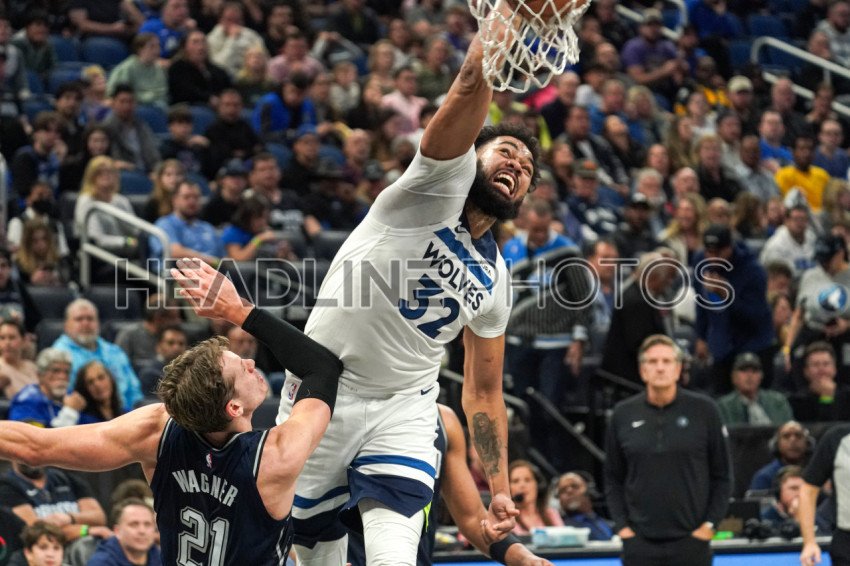 Orlando, Florida, USA, January 9, 2024, Minnesota Timberwolves forward Karl-Anthony Towns #32 makes a dunk at the Amway Center. (Photo Credit: Marty Jean-Louis)