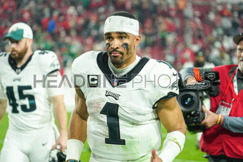 Tampa Bay, Florida, USA, January 15, 2024, Philadelphia Eagles quarterback Jalen Hurts #1 runs to the locker after the game at Raymond James Stadium. (Photo Credit: Marty Jean-Louis)