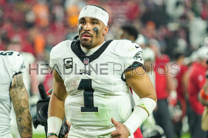 Tampa Bay, Florida, USA, January 15, 2024, Philadelphia Eagles quarterback Jalen Hurts #1 runs to the locker after the game at Raymond James Stadium. (Photo Credit: Marty Jean-Louis)