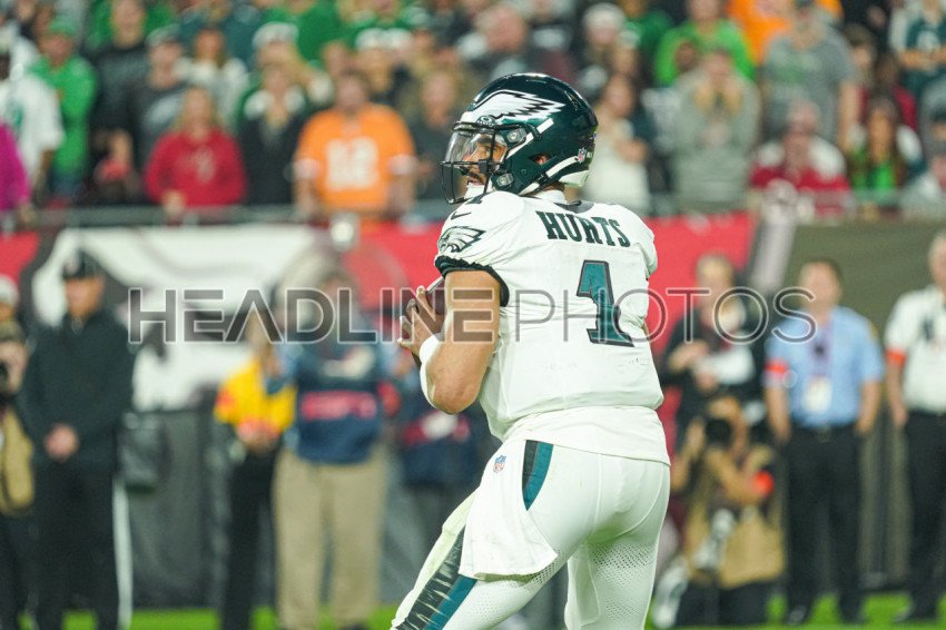 Tampa Bay, Florida, USA, January 15, 2024, Philadelphia Eagles quarterback Jalen Hurts #1 makes a pass at Raymond James Stadium. (Photo Credit: Marty Jean-Louis)