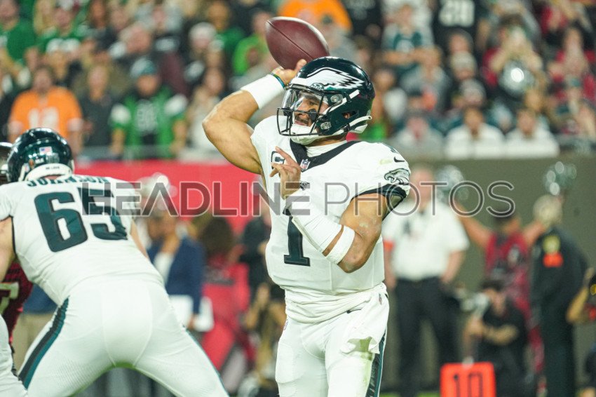 Tampa Bay, Florida, USA, January 15, 2024, Philadelphia Eagles quarterback Jalen Hurts #1 makes a pass at Raymond James Stadium. (Photo Credit: Marty Jean-Louis)