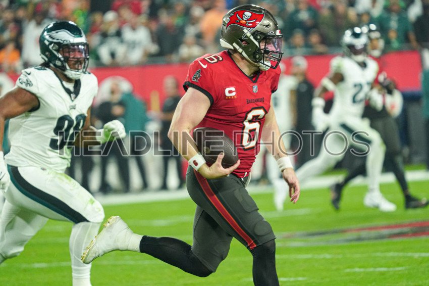 Tampa Bay, Florida, USA, January 15, 2024, Tampa Bay Buccaneers quarterback Baker Mayfield #6 on the run at Raymond James Stadium. (Photo Credit: Marty Jean-Louis)