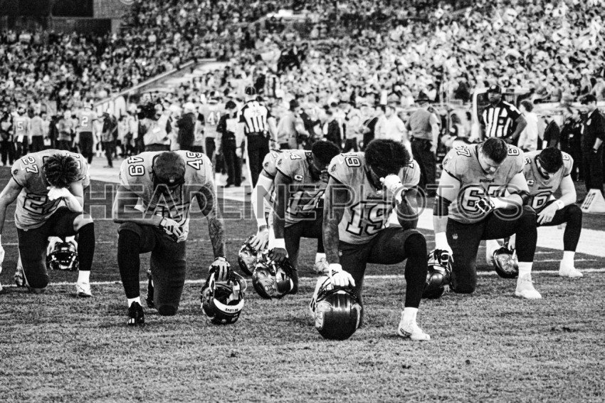 Tampa Bay, Florida, USA, January 15, 2024, Tampa Bay Buccaneers players kneel before the game at Raymond James Stadium. (Photo Credit: Marty Jean-Louis)