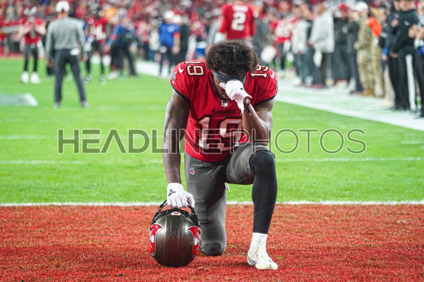 Tampa Bay, Florida, USA, January 15, 2024, Tampa Bay Buccaneers player David Moore #19 kneel down for a player at Raymond James Stadium. (Photo Credit: Marty Jean-Louis)