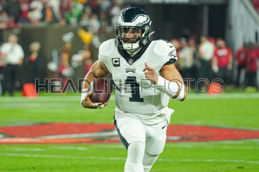 Tampa Bay, Florida, USA, January 15, 2024, Philadelphia Eagles quarterback Jalen Hurts #1 on the run at Raymond James Stadium. (Photo Credit: Marty Jean-Louis)