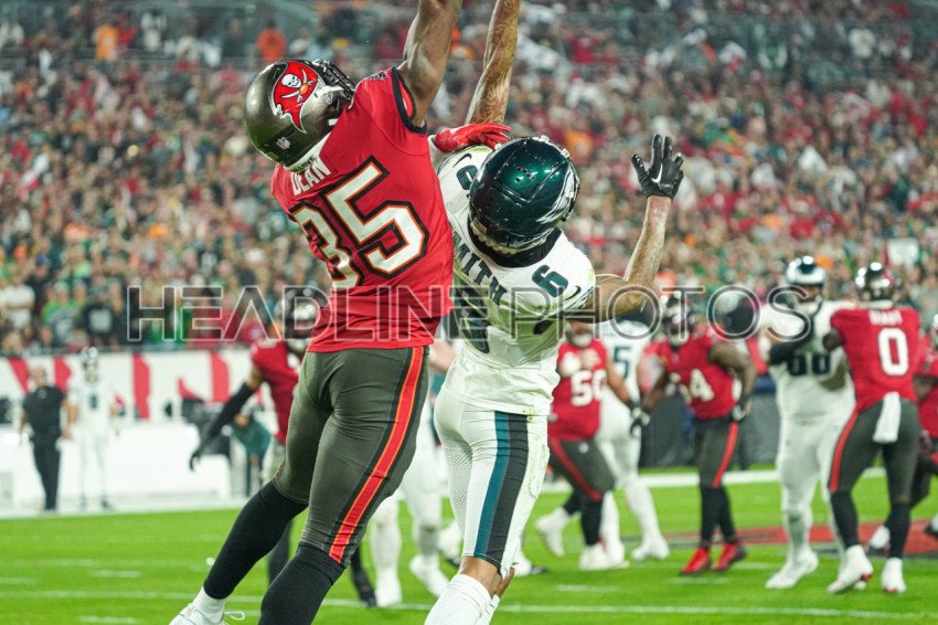 Tampa Bay, Florida, USA, January 15, 2024, Tampa Bay Buccaneers Corner Back Jamel Dean #35 attempt to make an interception from DeVonta Smith #6 at Raymond James Stadium. (Photo Credit: Marty Jean-Louis)