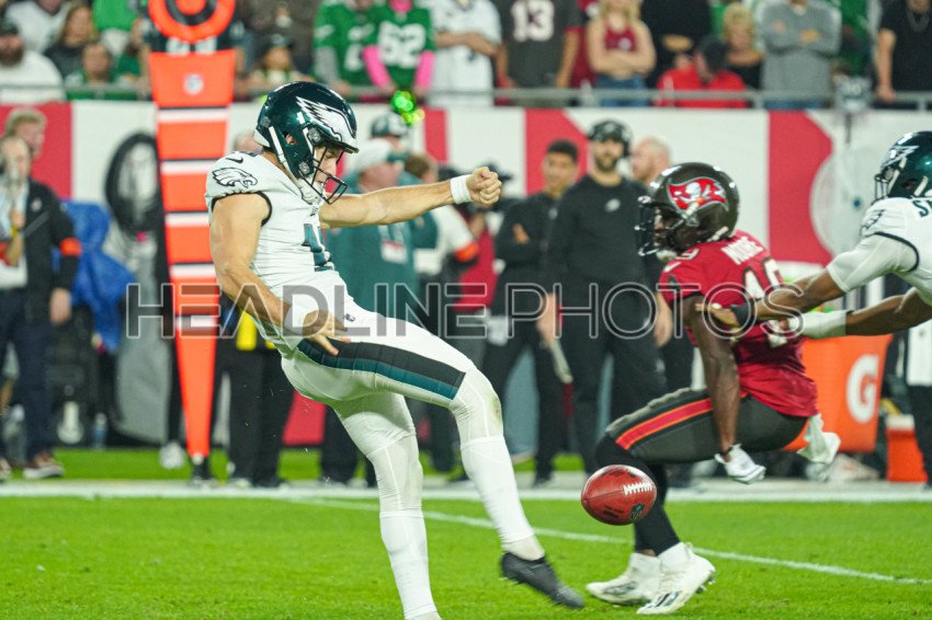 Tampa Bay, Florida, USA, January 15, 2024, Philadelphia Eagles punter Braden Mann #10 makes a kick at Raymond James Stadium. (Photo Credit: Marty Jean-Louis)