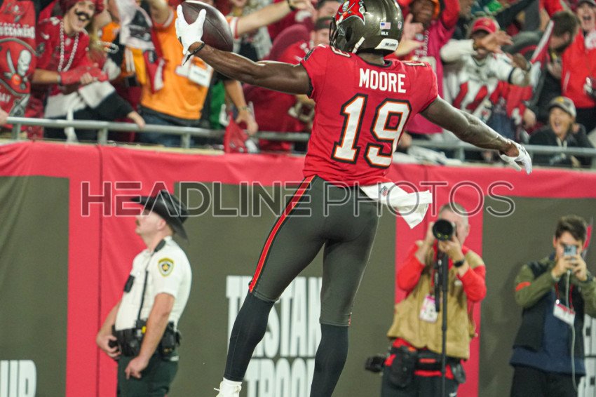 Tampa Bay, Florida, USA, January 15, 2024, Tampa Bay Buccaneers player David Moore #19 celebrate after a touch down at Raymond James Stadium. (Photo Credit: Marty Jean-Louis)