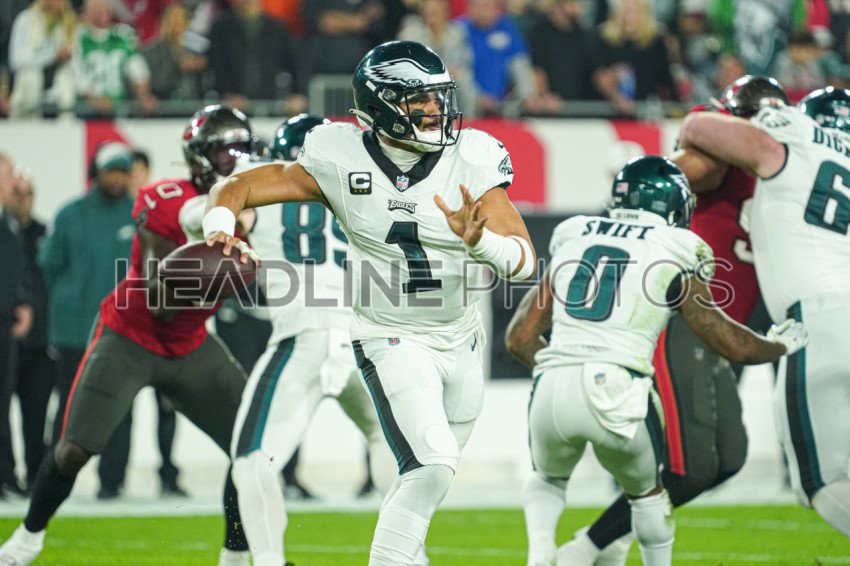 Tampa Bay, Florida, USA, January 15, 2024, Philadelphia Eagles quarterback Jalen Hurts #1 makes a pass at Raymond James Stadium. (Photo Credit: Marty Jean-Louis)