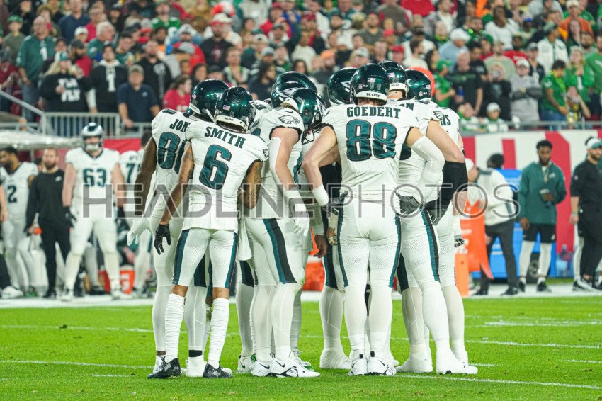 Tampa Bay, Florida, USA, January 15, 2024, Philadelphia Eagles players huddle during the first quarter at Raymond James Stadium. (Photo Credit: Marty Jean-Louis)