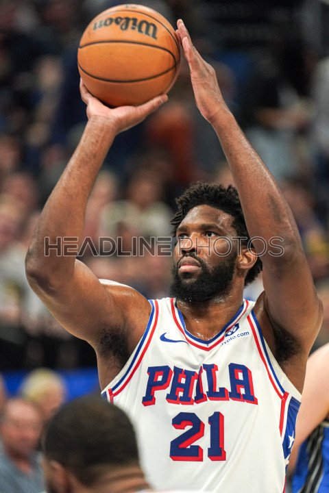 Orlando, Florida, USA, January 19, 2024, Philadelphia 76ers center Joel Embiid #21 shoots a free throw in the first half at the Amway Center. (Photo Credit: Marty Jean-Louis)