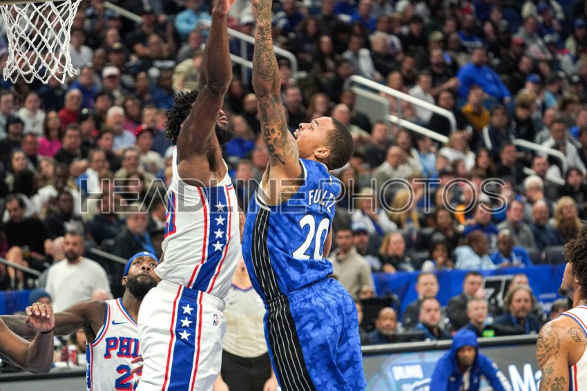 Orlando, Florida, USA, January 19, 2024, Orlando Magic guard Markelle Fultz #20 attempt to score as Joel Embiid #21 attempt to block the shot at the Amway Center. (Photo Credit: Marty Jean-Louis)