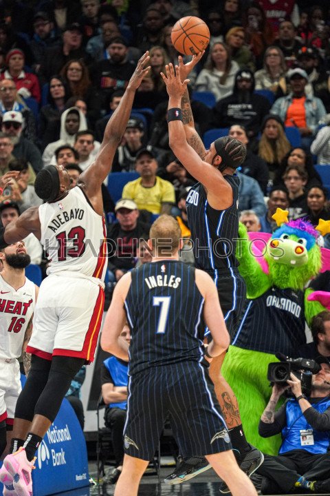 Orlando, Florida, USA, January 31, 2024, Orlando Magic forward Paolo Banchero #5 attempt to score as Bam Adebayo #13 attempt to block at the Kia Center. (Photo Credit: Marty Jean-Louis)