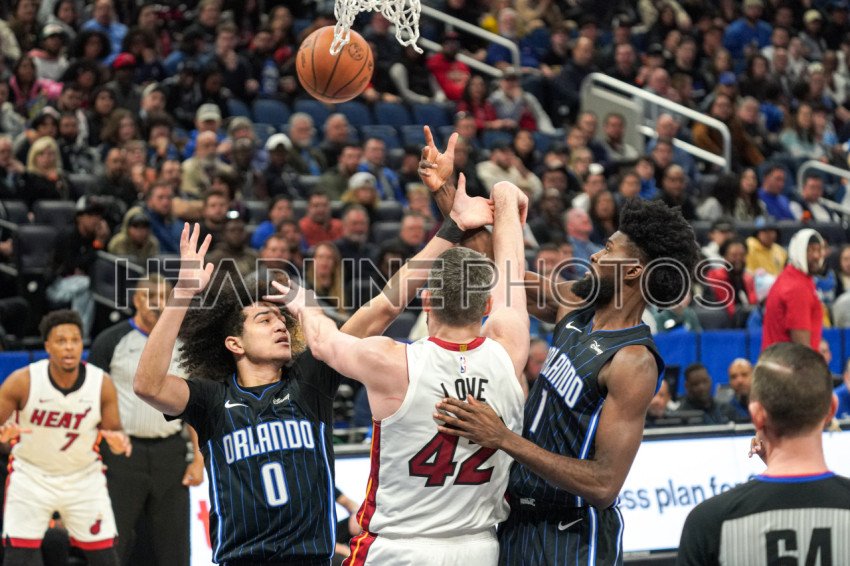 Orlando, Florida, USA, January 31, 2024, Miami Heat player Kevin Love #42 attempt to make a pass as Jonathan Isaac #1 and Anthony Black #0 attempt to block at the Kia Center. (Photo Credit: Marty Jean-Louis)