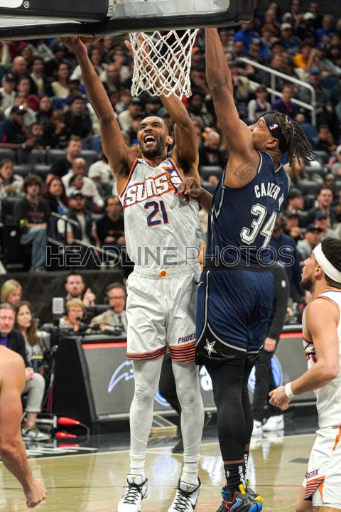 Orlando, Florida, USA, January 28, 2024, Phoenix Suns player Keita Bates-Diop #21 attempt to make a basket as Wendell Carter Jr #34 tries to block at the Kia Center. (Photo Credit: Marty Jean-Louis)