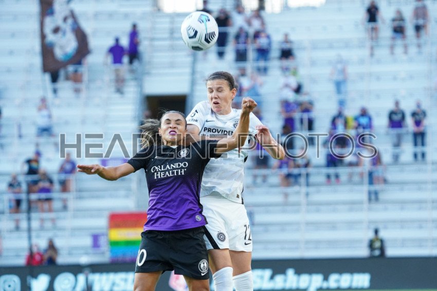 Orlando, Florida, USA, May 26, 2021, Portland Thorns Midfielder Christine Sinclair #12 wins the header at Exploria Stadium (Photo Credit: Marty Jean-Louis)