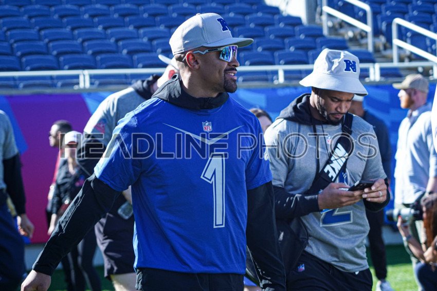 Orlando, Florida, USA, February 2, 2024, Jalen Hurts #1 of the Philadelphia Eagles During AFC vs NFC NFL Pro Bowl Practice Session at Camping World Stadium. (Photo Credit: Marty Jean-Louis)
