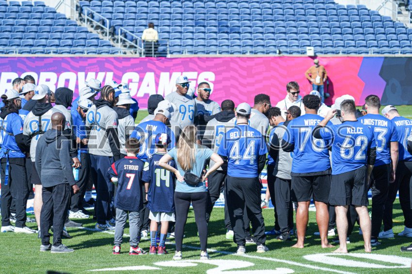 Orlando, Florida, USA, February 2, 2024, players huddle During AFC vs NFC NFL Pro Bowl Practice Session at Camping World Stadium. (Photo Credit: Marty Jean-Louis)