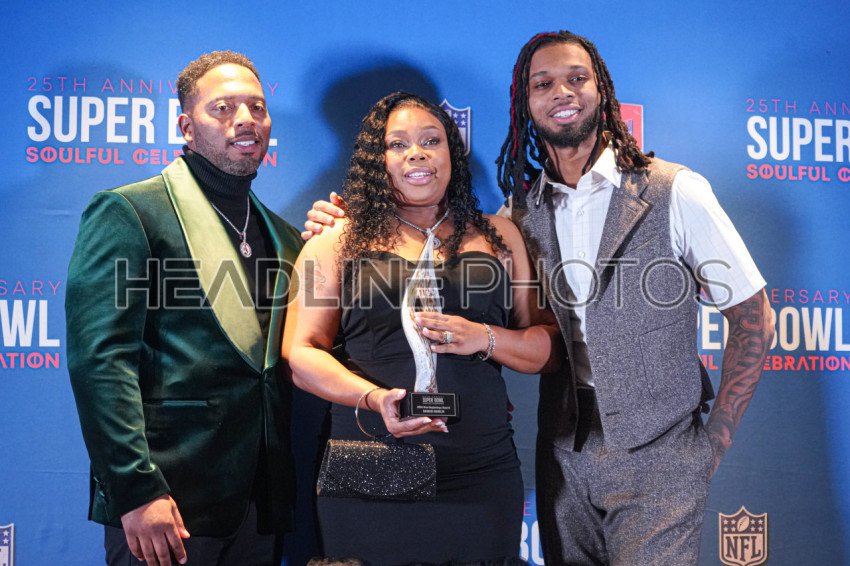 Las Vegas, Nevada, USA, February 7, Bufallo Bills Safety Damar Hamlin (far right) along with his Father Mario Hamlin and Mother Nina Hamlin back stage after receiving an award during the 25th Annual Super Bowl Soulfoul Celebration at the Palms Resort in Las Vegas, Nevada. (Photo Credit: Marty Jean-Louis)