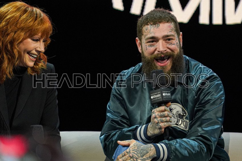 Las Vegas Nevada, USA, February 8, 2024, Rapper Post Malone speaking during the 2024 Apple Music Super Bowl Halftime Show Press Conference at the Mandalay Bay Resort (Photo Credit: Marty Jean-Louis)