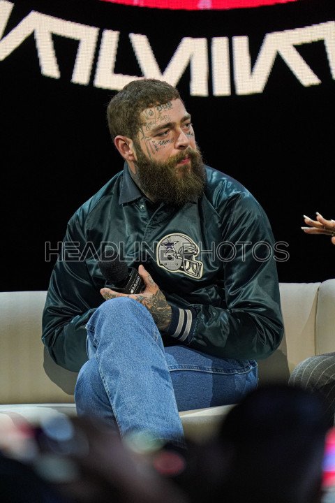 Las Vegas Nevada, USA, February 8, 2024, Rapper Post Malone speaking during the 2024 Apple Music Super Bowl Halftime Show Press Conference at the Mandalay Bay Resort (Photo Credit: Marty Jean-Louis)