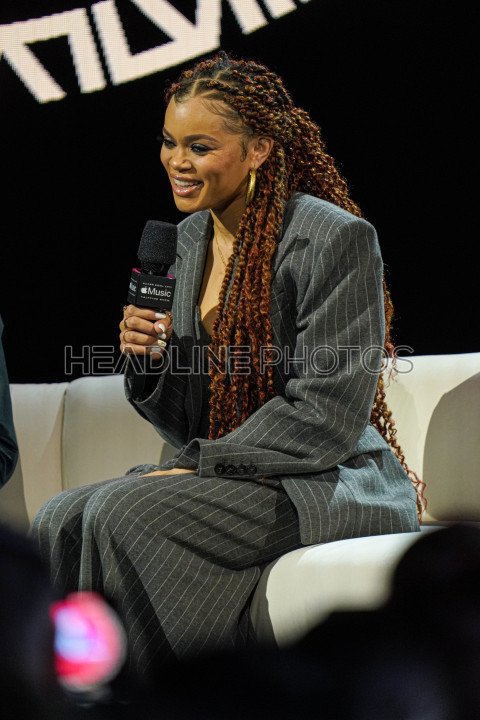 Las Vegas Nevada, USA, February 8, 2024, Singer Audra Day speaking during the 2024 Apple Music Super Bowl Halftime Show Press Conference at the Mandalay Bay Resort (Photo Credit: Marty Jean-Louis)