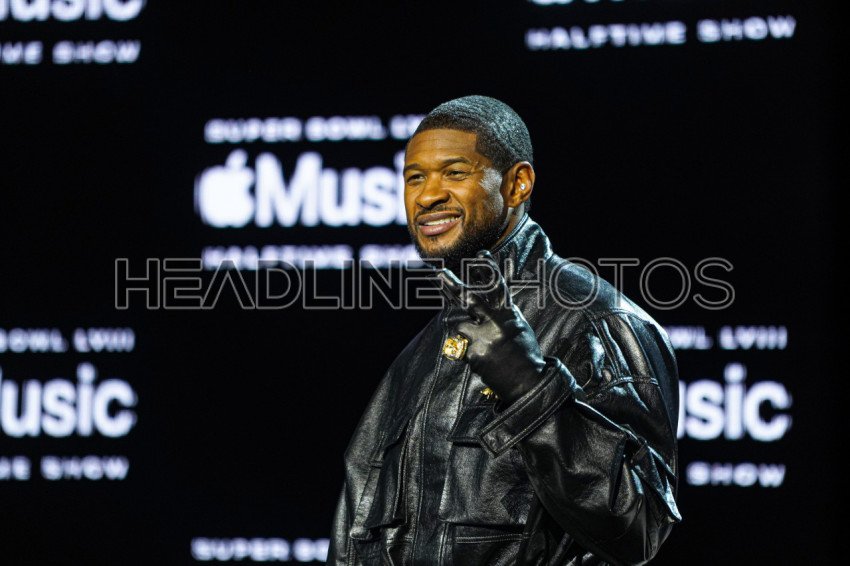 Las Vegas Nevada, USA, February 8, 2024, R&B Artist Usher take pictures during the 2024 Apple Music Super Bowl Halftime Show Press Conference at the Mandalay Bay Resort (Photo Credit: Marty Jean-Louis)
