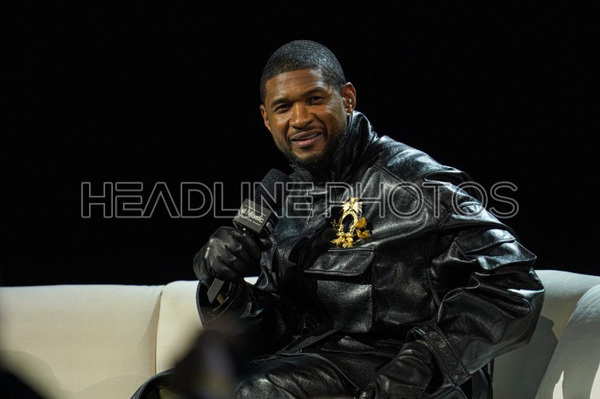 Las Vegas Nevada, USA, February 8, 2024, R&B Artist Usher speaking during the 2024 Apple Music Super Bowl Halftime Show Press Conference at the Mandalay Bay Resort (Photo Credit: Marty Jean-Louis)