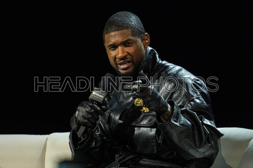 Las Vegas Nevada, USA, February 8, 2024, R&B Artist Usher speaking during the 2024 Apple Music Super Bowl Halftime Show Press Conference at the Mandalay Bay Resort (Photo Credit: Marty Jean-Louis)