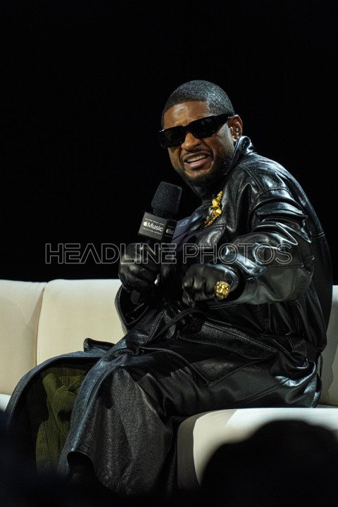 Las Vegas Nevada, USA, February 8, 2024, R&B Artist Usher speaking during the 2024 Apple Music Super Bowl Halftime Show Press Conference at the Mandalay Bay Resort (Photo Credit: Marty Jean-Louis)