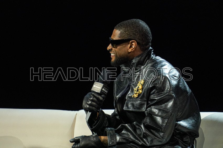 Las Vegas Nevada, USA, February 8, 2024, R&B Artist Usher speaking during the 2020 Apple Music Super Bowl Halftime Show Press Conference at the Mandalay Bay Resort (Photo Credit: Marty Jean-Louis)