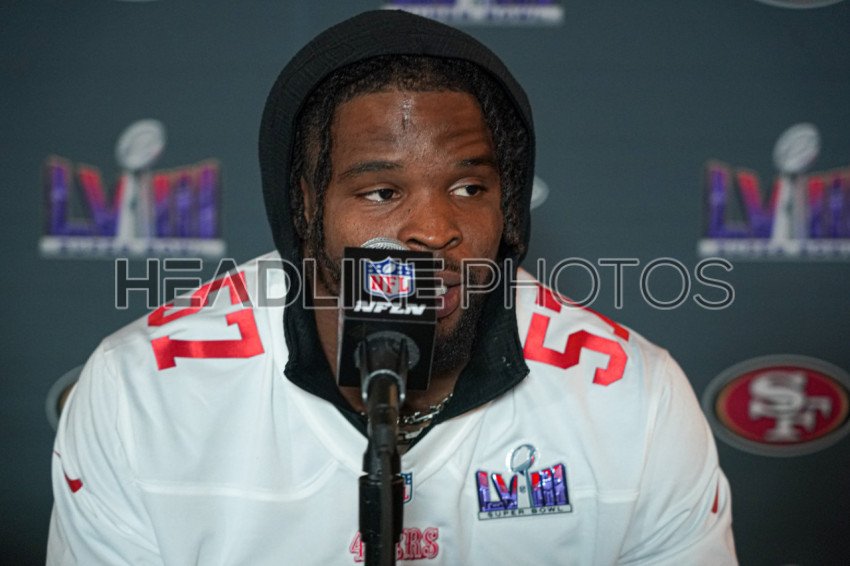 Henderson, Nevada, USA, February 8, 2024, 49ers linebacker Dre Greenlaw during the Pre Super Bowl Press Conference (Photo Credit: Marty Jean-Louis)