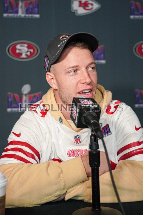Henderson, Nevada, USA, February 8, 2024, 49ers Running back Christian McCaffrey during the Pre Super Bowl Press Conference (Photo Credit: Marty Jean-Louis)