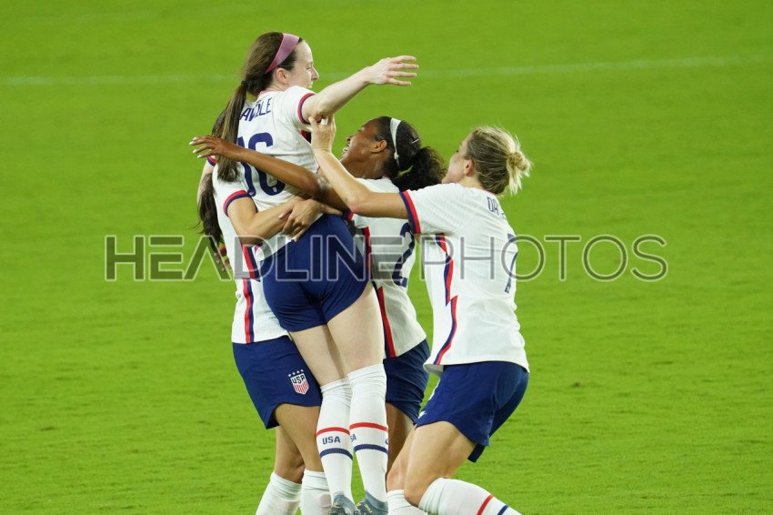 Orlando, Florida, USA, February 18, 2021, USA players celebrate goal during the SheBelieves Cup at Exploria Stadium (Photo Credit: Marty Jean-Louis)