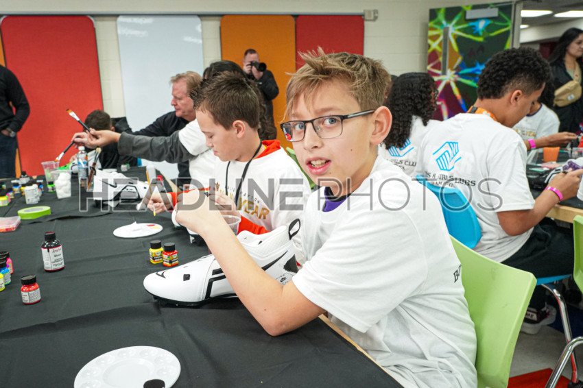 Henderson, Nevada, USA, February 9, 2024, A young man looks at the camera as he paint a pair of cleats during the Walter Payton NFL Man of the Year Event At the Donald W. Reynolds Boys & Girls Club (Photo Credit: Marty Jean-Louis)