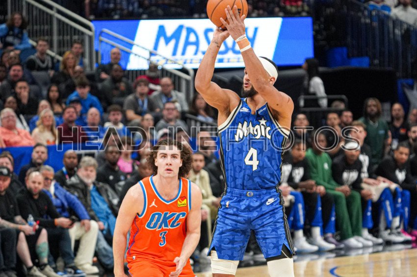 Orlando, Florida, USA, February 13, 2024, Orlando Magic guard Jalen Suggs #4 shoots a three in the first half at the Kia Center. (Photo Credit: Marty Jean-Louis)