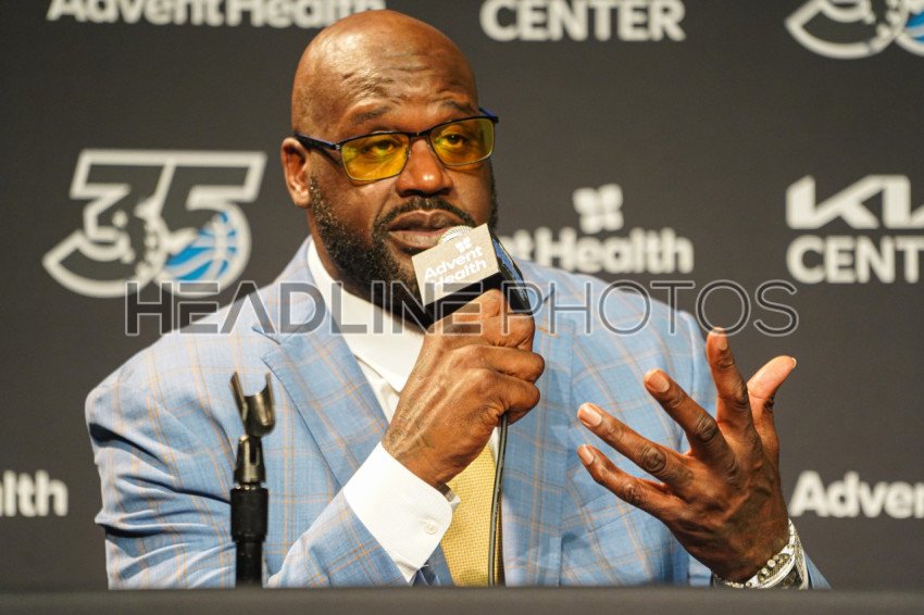 Orlando, Florida, USA, February 13, 2024, Former Orlando Magic Player Shaquille O'Neal during a pre-game press conference to retire his Jersey number at the Kia Center. (Photo Credit: Marty Jean-Louis)