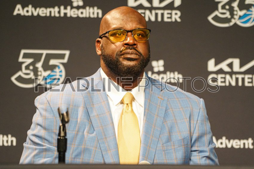 Orlando, Florida, USA, February 13, 2024, Former Orlando Magic Player Shaquille O'Neal during a pre-game press conference to retire his Jersey number at the Kia Center. (Photo Credit: Marty Jean-Louis)