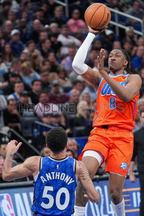 Orlando, Florida, USA, February 13, 2024, Oklahoma Thunder forward Jalen Williams jump to shoot in the second half at the Kia Center. (Photo Credit: Marty Jean-Louis)