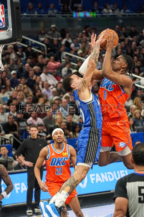 Orlando, Florida, USA, February 13, 2024, Oklahoma Thunder forward Jalen Williams #8 attempt to make a basket as Cole Anthony #50 attempt to make a block in the second half at the Kia Center. (Photo Credit: Marty Jean-Louis)