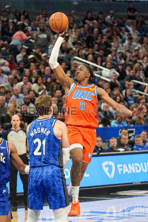 Orlando, Florida, USA, February 13, 2024, Oklahoma Thunder forward Jalen Williams #8 attempt to make a basket in the second half at the Kia Center. (Photo Credit: Marty Jean-Louis)