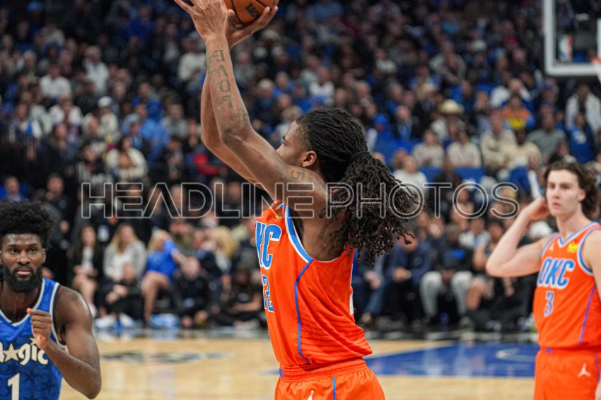 Orlando, Florida, USA, February 13, 2024, Oklahoma Thunder guard Cason Wallace #22 shoot a three at the Kia Center. (Photo Credit: Marty Jean-Louis)