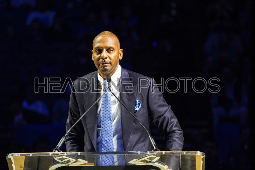 Orlando, Florida, USA, February 13, 2024, Penny Hardaway speaks During the Shaquille O'Neal Jersey Retirement Ceremony at the Kia Center. (Photo Credit: Marty Jean-Louis)