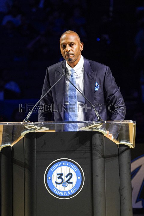 Orlando, Florida, USA, February 13, 2024, Penny Hardaway speaks During the Shaquille O'Neal Jersey Retirement Ceremony at the Kia Center. (Photo Credit: Marty Jean-Louis)