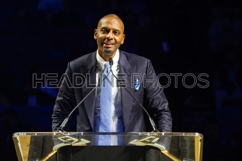 Orlando, Florida, USA, February 13, 2024, Penny Hardaway speaks During the Shaquille O'Neal Jersey Retirement Ceremony at the Kia Center. (Photo Credit: Marty Jean-Louis)